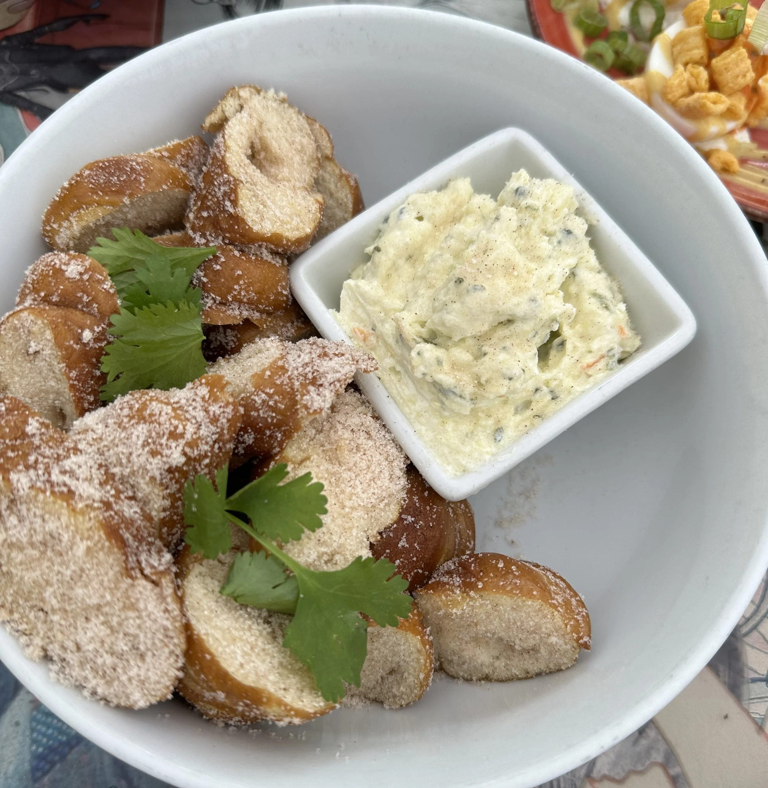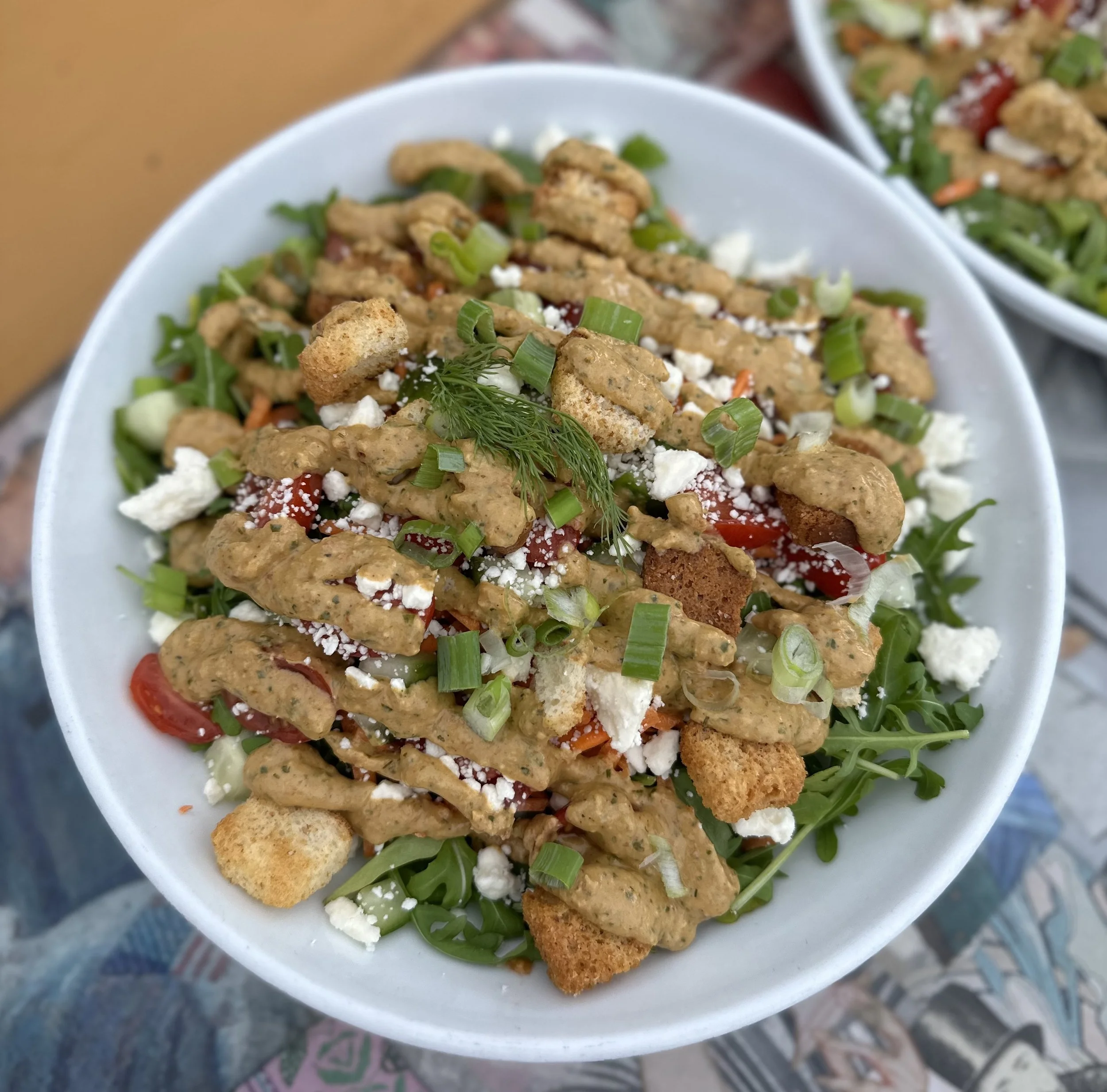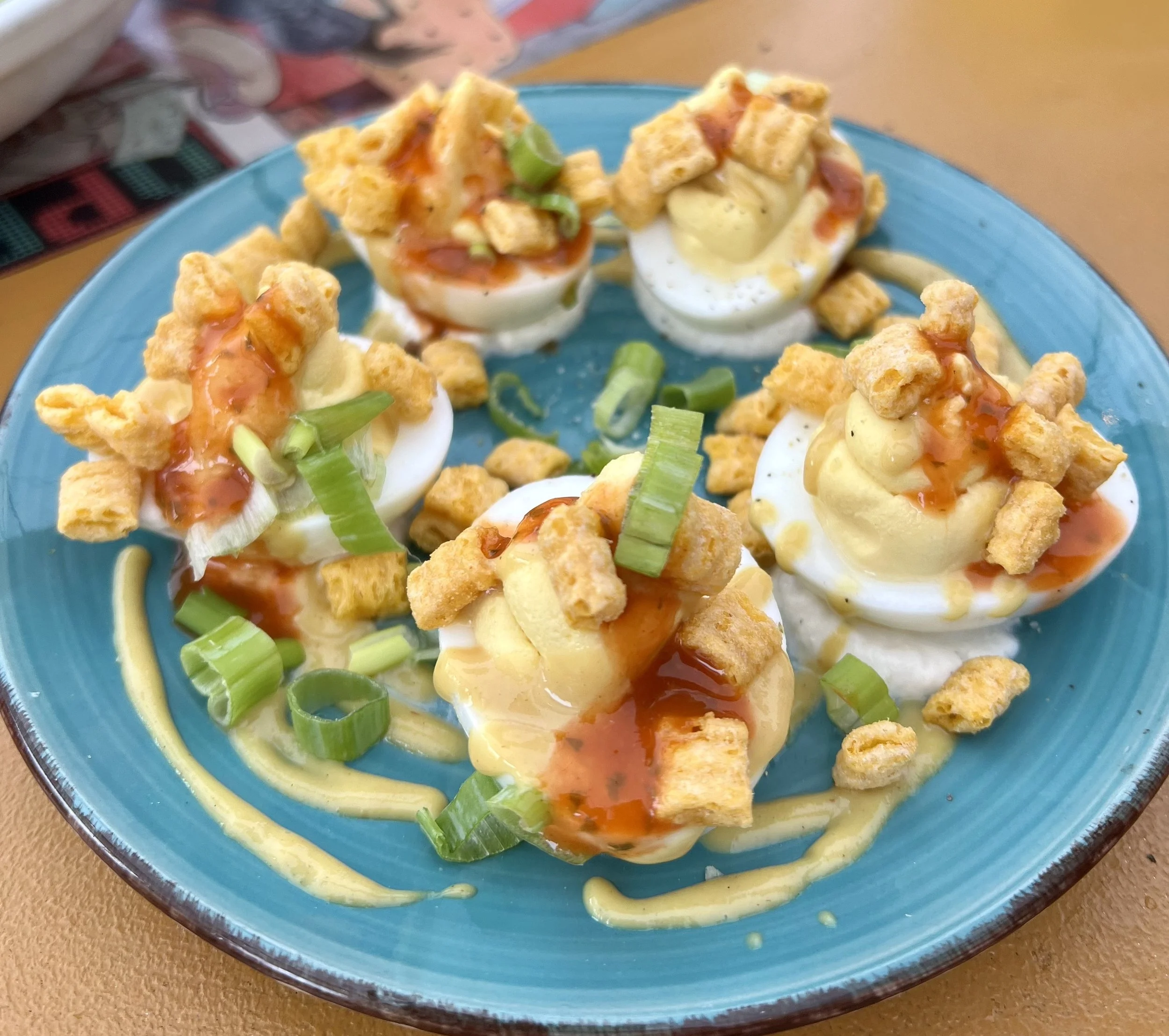 We were lucky enough to try most of the dishes on their current menu. To start we shared the Capn’ Crunch Deviled Eggs (trust us, they’re incredible) and Pretzel Bites dusted in cinnamon sugar and served with habanero-pineapple cream cheese dip. We also sampled both the Peanut Ginger and Dill Pickle Soups, both of which were creamy and rich with flavor. While an Arugula Salad might not initially sound like the most exciting option, the addition of crumbled feta and housemade red goddess dressing took it to a new level.