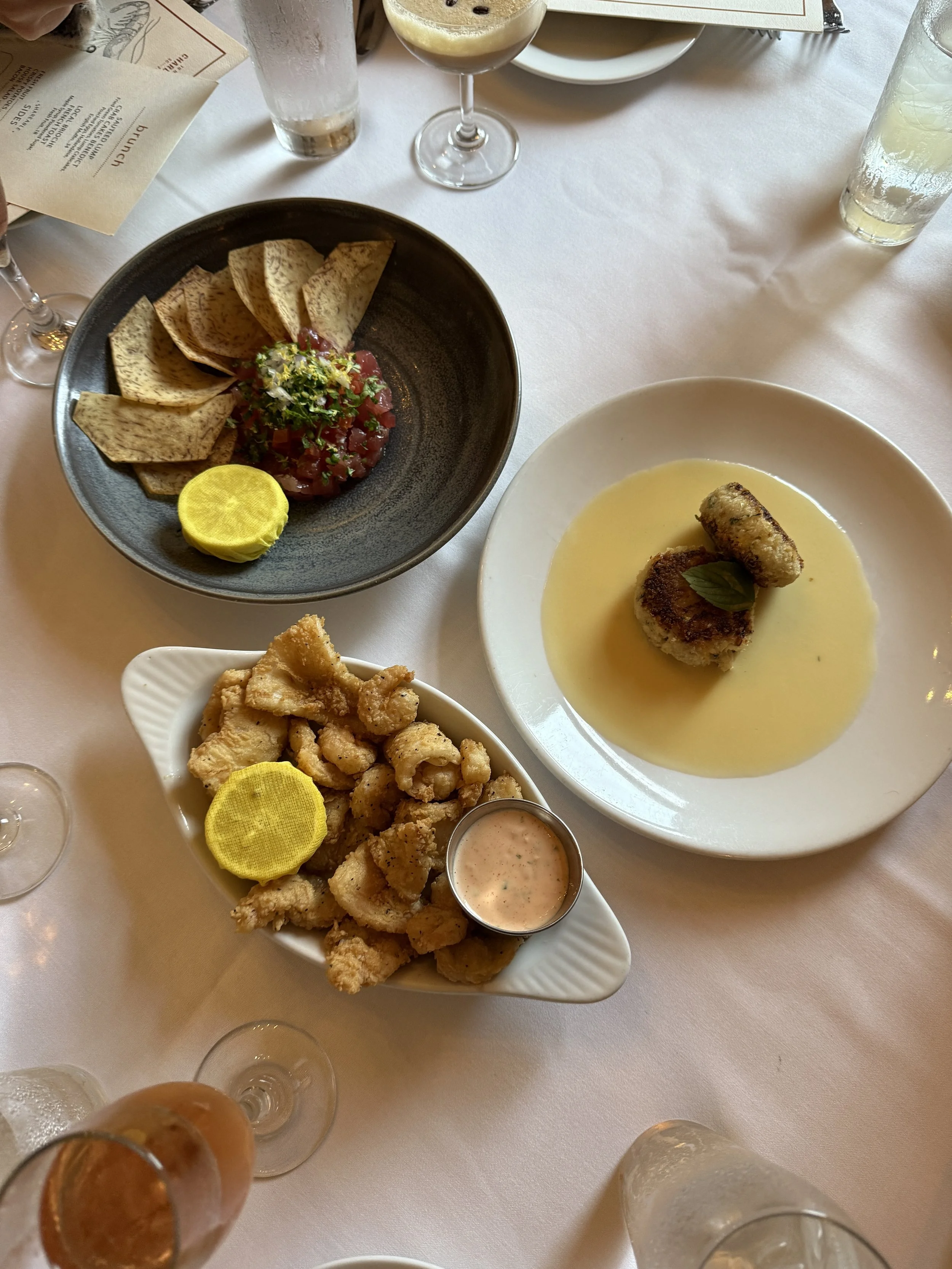 For appetizers, we went all in, with an assortment of fresh-caught seafood. The Sautéed Lump Crab Cakes, served with sweet corn, leek, basil and beurre blanc, were rich, buttery and packed with fresh crab flavor. The Crispy Calamari, paired with shrimp and a spicy tomato remoulade, offered a perfect crunch and subtle heat, and Oyster Casino, topped with garlic butter, smoked bacon, asiago cheese, and toasted breadcrumbs, were favorites. The Tuna Tartare, with jalapeño, shallot, EVOO, tomato, lemon and herbs, delivered a fresh, bright contrast to the richer dishes.